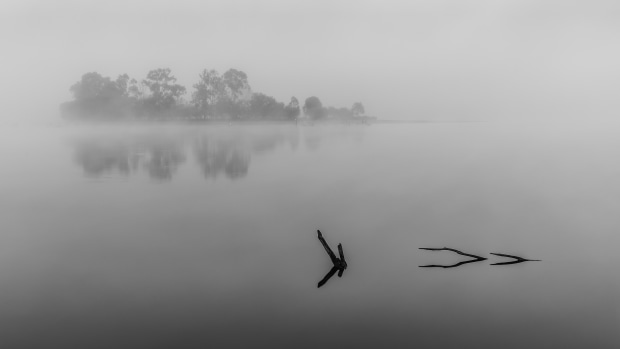Dawn breaks over Gordonbrook Dam on a cold, still, foggy morning, revealing a minimalist landscape with receding detail.