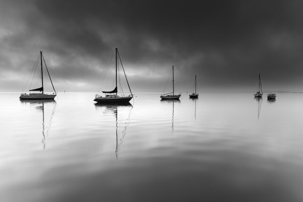 Merrillie Redden, Monochrome Misty Morning Marina (Places)