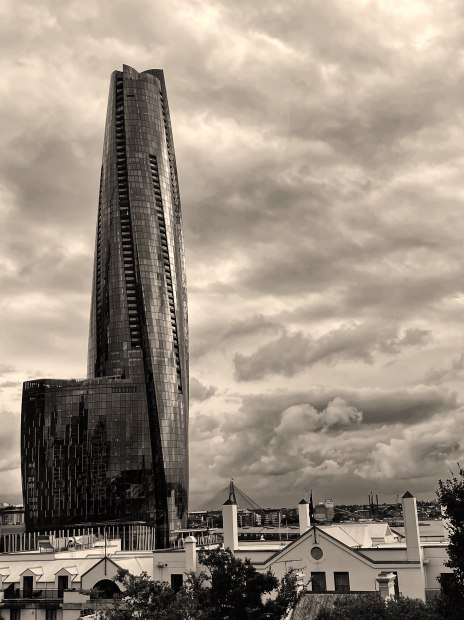Crown Casino, chimneys and stormy sky from Observatory Hill