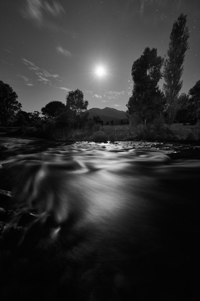 The moon rises over the highest peak in Victoria, Mt. Bogong, and shines onto the Kiewa River turning it into a silky sheet.