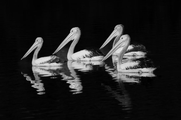 A pod of pelicans enjoying a morning swim fishing on Lake Guthridge, VIC. The darkness around the pelicans represents the harmful green algae that is currently present in the lake.
