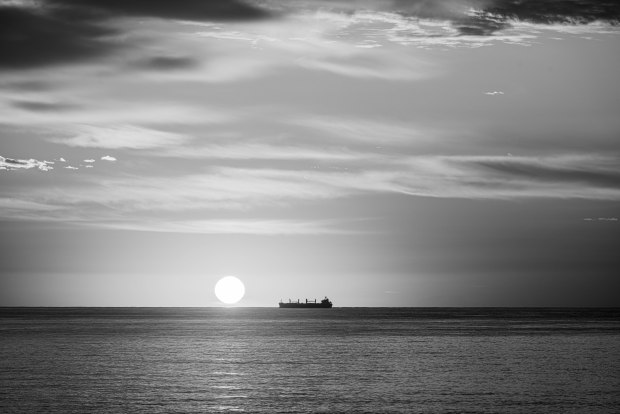 Sunrise as a ship approaches it.