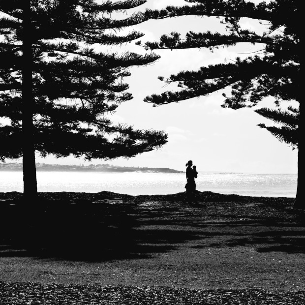 Mother carrying her baby as she strolls along the foreshore at a popular seaside town in South Australia