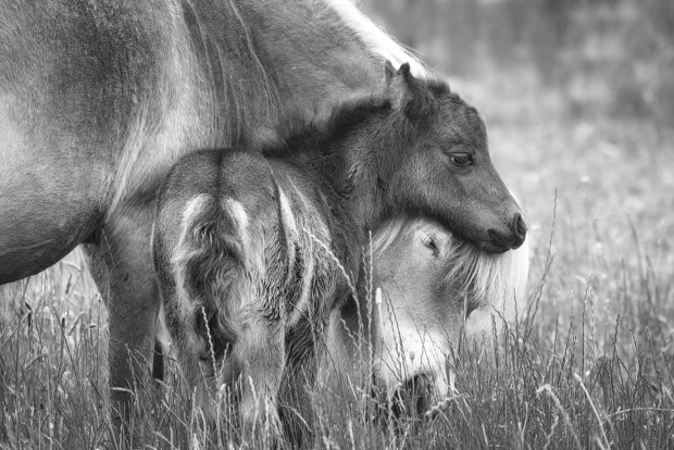 A day old Shetland pony foal stays close to her Mother while she is eating.