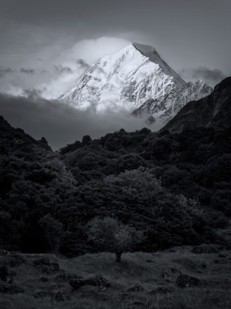 The peak of Mount Cook stayed shrouded in clouds all day until sunset. Just as I was about to head back to campsite, a sudden gust of wind dispersed the clouds, revealing the majestic summit. Without wasting a moment, I grabbed my camera and found a good spot near the campsite to capture this breathtaking moment.