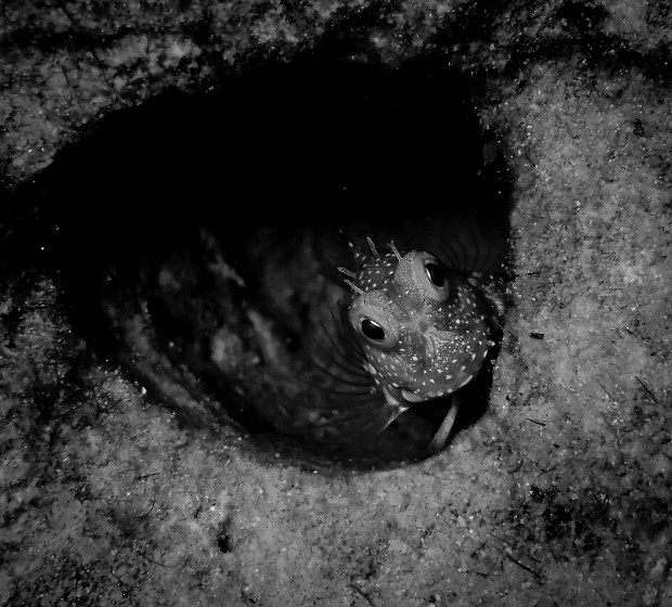 I catch a curious blenny watching me ever so closely as I pass by his stoney entranceway. He does not move nor retreat, just sits there and watches intently, perhaps wondering where in the world a creature like me came from. I call him 'Mr Blenny'. Mr Blenny's home is in the Solomon Islands, underwater of course!