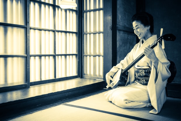 Geisha playing Shamisen in Kyoto Gion. With the sun shining through the window the spotlight was one of a natural nature.