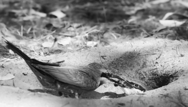 I have been diligently observing Rainbow Bee-eaters' behaviour in Huntly Streamside Reserve of Victoria, ever since some arrived from Queensland last summer. I found that the most touching moment was not about Rainbow Bee-eater mating, or catching insects, or going in and out of their nesting tunnel on the ground, it was the moment when baby bee-eaters stretch their head out from inside-of-tunnel to get food, especially reaching further out at tunnel entrance. Adult Bee-eaters deliberately stopped delivering food into the nesting tunnel, so to train baby Bee-eaters' ability get out gradually so to survive an independent life.