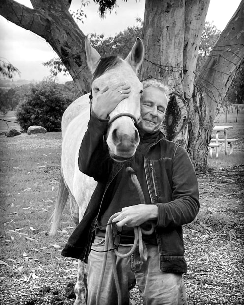 This is a picture of my husband and his sisters endurance horse Jimon. It demonstrates a mutual sense of contentment between man and horse.