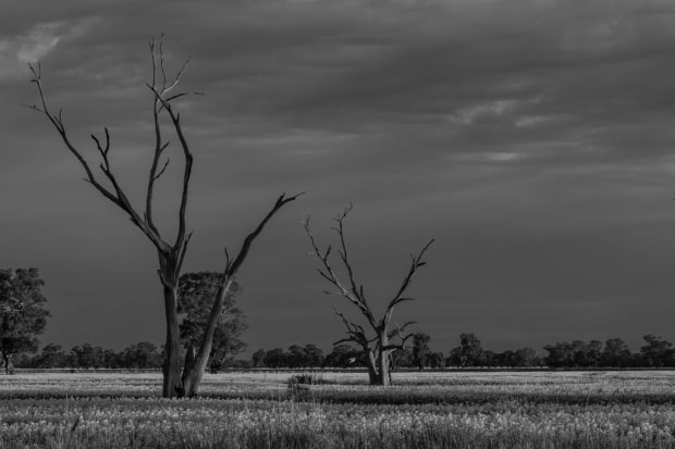 Surrounded by a flowering Canola crop, these dead trees stood out in the setting sun