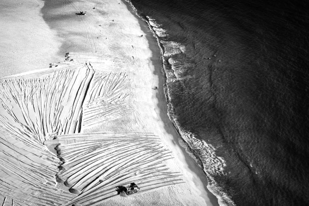 This photo shows a scene on Nazaré Beach in Portugal, where a bulldozer has turned the sand into a giant, leaf-like pattern with sweeping lines and curves. A few people and surfers are scattered around, making the whole thing feel even more impressive, like a mix of beach art and heavy machinery at work.