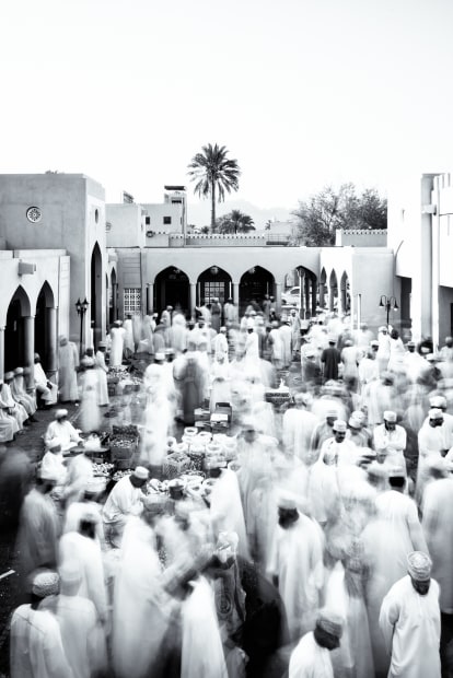 A view of the bustling market place during the morning trade in Nizwa Oman. Once a week many come to town to trade vegetables and livestock, socialise and catch up with old friends.