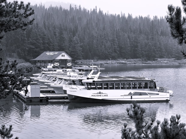 The smoke from recent bushfires at Jasper unfortunately made visibility too low for boat cruises to continue on the normally beautiful and picturesque Maligne Lake. The boats lay dormant waiting for the wind to change direction and to take the smoke haze with it so they could resume their duties of taking visitors out onto this famous panoramic lake.