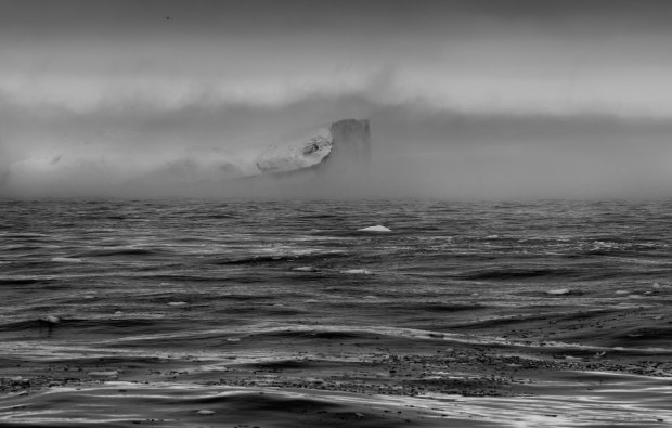 The wind gets up and the fog finally lifts from Disko Bay in Greenland after a few hours of complex navigation through a series of icebergs.