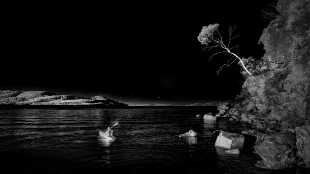 Autumn in Tasmania can be exquisite for photography, with calm, windless days, soft golden afternoon light, and glassy waters under cloudless skies. This photograph was taken on one of those exquisite autumn days in May 2025. The location is Northwest Bay in southern Tasmania, looking north from near Coningham Beach towards the Tinderbox peninsula, with South Arm and Bruny Island in the distance. I took this infrared 850nm photograph of my wife Bronwen as she paddled in her kayak. The dark glassy water reminded me of obsidian; a type of volcanic rock formed from quickly cooled lava which is typically black with a glassy lustre.