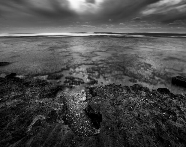 Looking over the ocean at low tide on the reef at Flat Rocks, Greenough, Western Australia.
