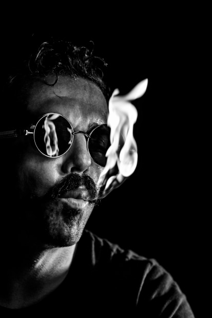 Successfully capturing the details of fire without additional lighting is a uniquely difficult feat. Flames create bright white highlights and leave deep black shadows in their absence. In this image those lighting qualities were used to create an Old Hollywood feel. Here, our performer is lit entirely by the fire "candle" he is blowing and the lit fire torch he is holding out of frame. Casting beautiful bright highlights across our models sunglasses and moustache these flames draw us in, just as they would watching his show up close in person.