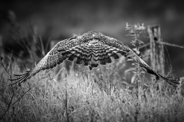 A 'Spotted harrier' cruises low over pasture grasses in the relentless search for prey.