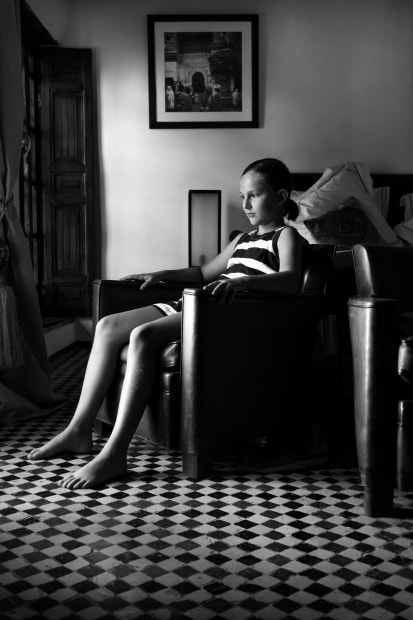 This is a photo of my daughter taken in a riad in Fez, Morocco. She was exhausted after a day of walking the Medina and just sat there intently watching other guests in the courtyard below. While Morroco is full of colour the contrasting light meant that the image seemed more striking in black and white.