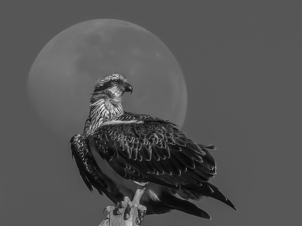 Osprey perched in front of the early morning moon.