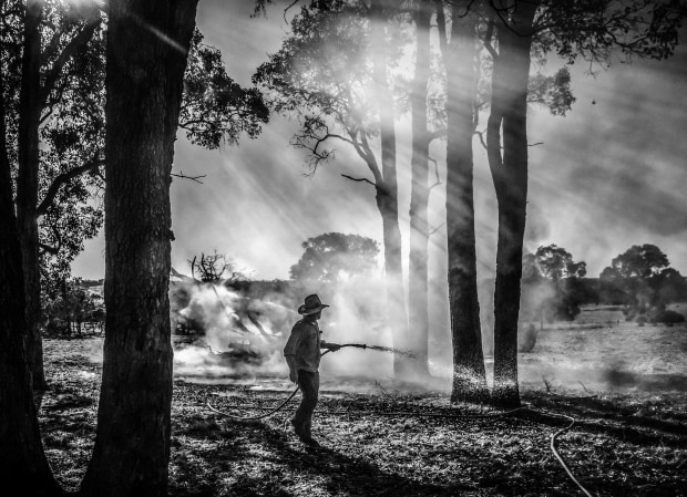 Sunlight filters through smoke as a farmer monitors a controlled burn on his property.