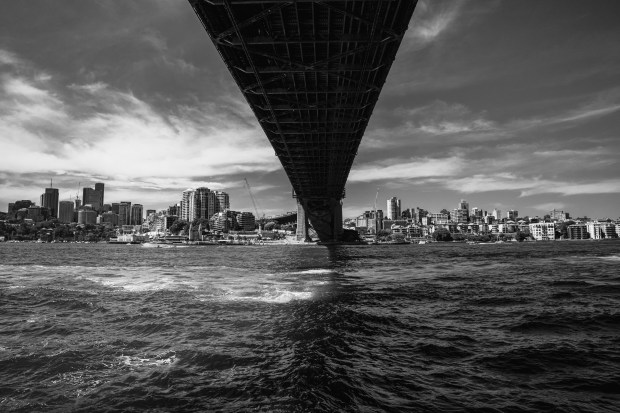 A glance at Sydney Harbour from underneath the bridge. The almost neat separation between light and shadow on the surface of waters trouble by the passing of the boats gives back an interesting contrast that in my opninion sits effectively with the concept and the visual rendering of the monochrome brief.