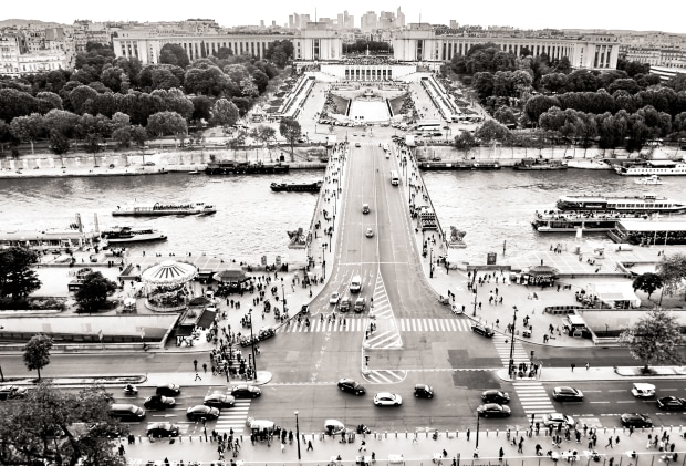 Major cities can be summed up with a few descriptive adjectives, but not Paris. A view from the Eiffel Tower to Trocadero. People watching, at a distance.