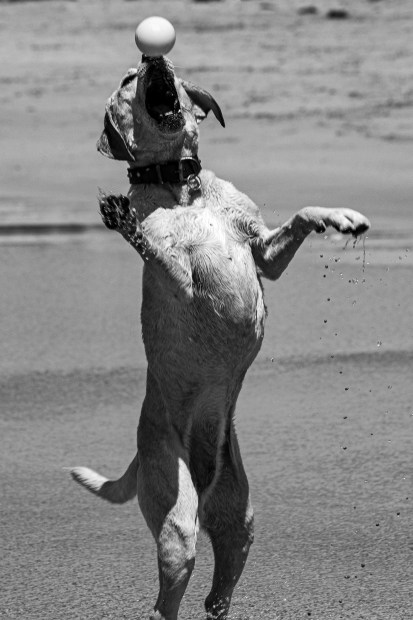 A dog playing with a ball down at the beach