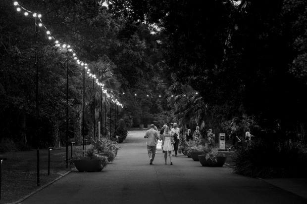 It's ironic that I am using this photo, It was taken on an evening where I had gone to see Chihuly Nights, a bright and colourful exhibition of glass and colour being held in The Adelaide Botanic Gardens. But as I was approaching the entry to the right, the directional lights leading down the path caught my attention. It looked interesting so I stopped and captured this photo as people were entering the main part of the exhibition. After uploading it I it looked good in Colour. But I wanted to see it in B&W like I do a lot of my photos, and came up with this after adjusting the tones. I had gone to capture all the colour of the night, but this photo came out as my favourite!