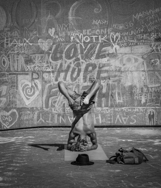 A yogee peacefully navigates an inverted pose next to a wall covered with hand-drawn artwork and slogans, during the New Zealand Parliament protests of 2022