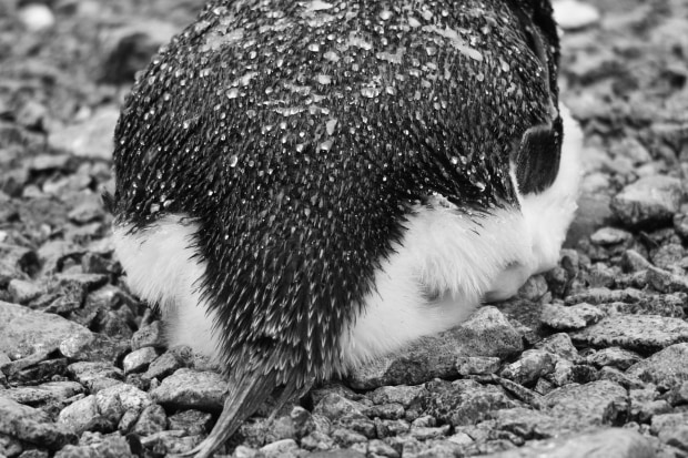 This penguin was in a snow storm, head down, bum up, in an effort to remain warm as the snow continued to cover its back;, located near Horseshoe Island in Antartica 2024.