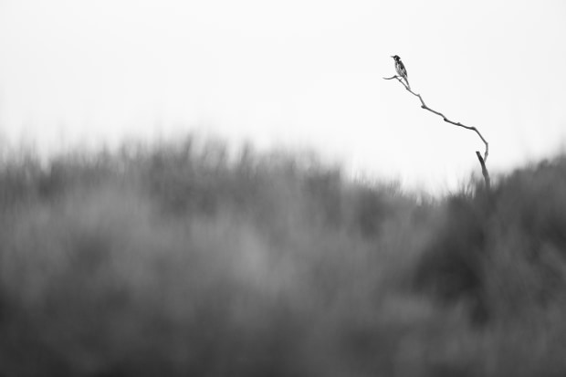 Guarding its territory, a New Holland Honeyeater stands tall on a lonely branch while chirping angrily. Calling with the total volume of its lungs, it warns other feathered visitors to stay away as it hoards the tiny piece of land. Determined, the honeyeater flies off to ward off the bird, only to return once more to its perch to continue its protective duty.