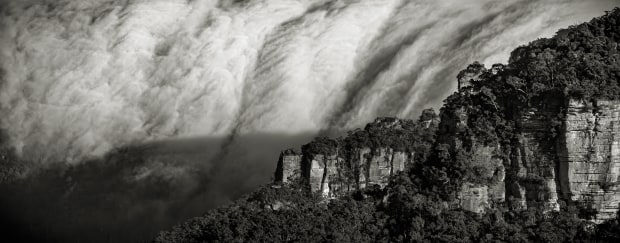 Phantom Falls is a local and very occasional phenomena at Katoomba in the Blue Mountains NSW. Seen and shot from a distance it reminded me of the big wave images from Nazaré, Portugal.