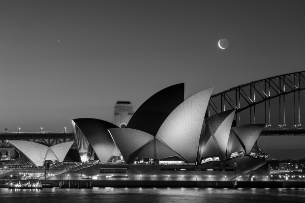 Lighting up the Sydney Opera House & Harbour Bridge with the Crescent Moon and Jupiter.