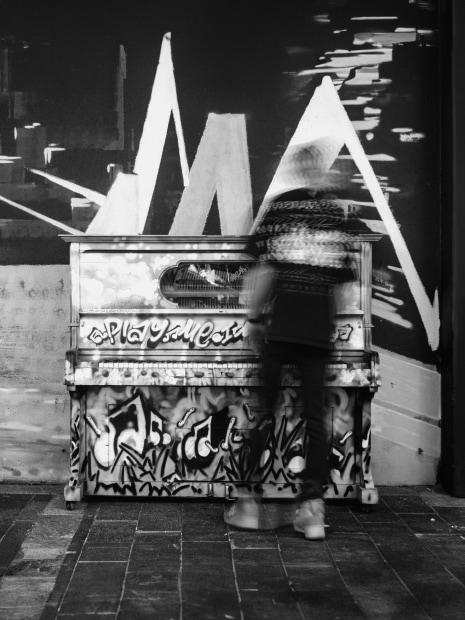 A young street musician bashes out a tune on a community piano in Woden Town Centre ACT. Capturrd in infrared and converted to monochrome.