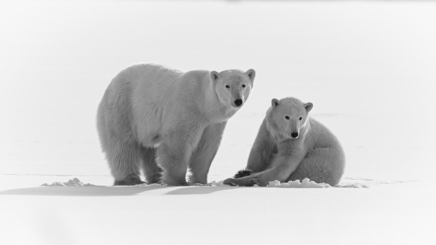 Polar bear mother and cub were photographed on a small frozen lake close to the coast at Hudson Bay. I stayed on the bank as getting lower would have given a cluttered background. The sun was low in the sky, filtered through cloud. I set the tripod up on the bank and waited for movement, keeping up on the bank and waited for movement while keeping the bears on the same focal plane.