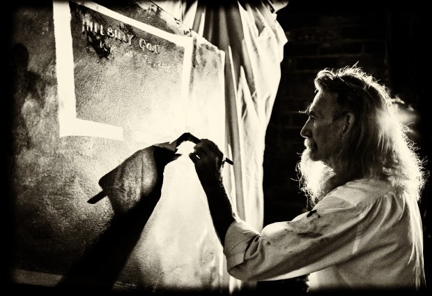 The artist was painting the very energetic band "The Hillbilly Goats" at the 2020 Tamworth country Music Festival.