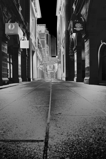 Post Office Lane a pedestrian thoroughfare at Brisbane's Iconic GPO, late of a Sunday afternoon, presented the rare opportunity of a pavement level image.