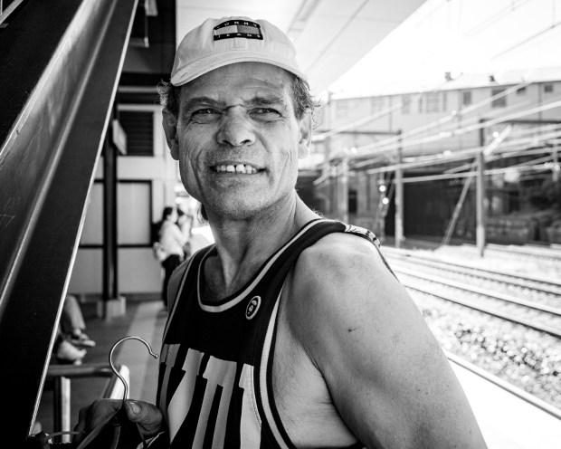 "I'm Reeneye from Redfern, I like your hat man" was my subject's initial introduction whilst I awaited my train on Newtown station, Sydney. We got to a chatting and established a connection before, on seeing my camera around my neck, enquired what I was taking photos of? I explained that I usually have a camera with me and was simply documenting a bit of street whilst visiting for the Head On Photo Festival. He asked me if I ever take portraits of characters such as himself? I said, sure, I can. We only made the one photograph, both happy with the exchange, we parted ways, and this is the result.