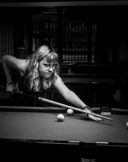 In the quiet aftermath of the break, she lines up her next shot with calm focus. The monochrome tones emphasize the lines—of the table, the cue, her form—bringing balance and grace to a fleeting moment of control and clarity within the chaos of the game.