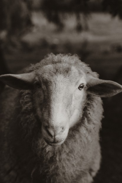 A sheep's direct gaze captured in black and white. The detailed texture of wool against the soft-focus background creates an intimate portrait that reveals the quiet dignity of a creature often overlooked. Simple, observant, present.