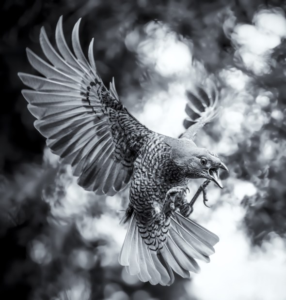 A female Satin Bowerbird coming in to protect her young from an incoming Catbird.
