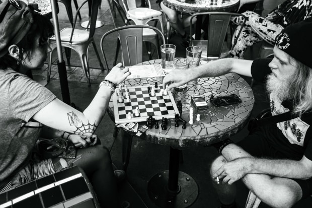 Pub patrons enjoying a summer time game of chess