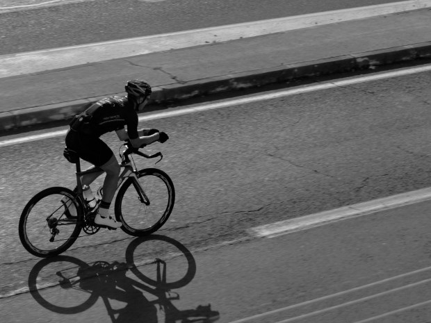 I saw a group of cyclists on a road in Europe. I took a shot of this cyclist with a strong shadow casted on the road creating a contrast for a B/W shot.