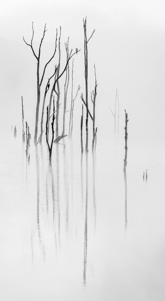 Early in the morning birds are just waking up in thick milky fog over a quiet lake.