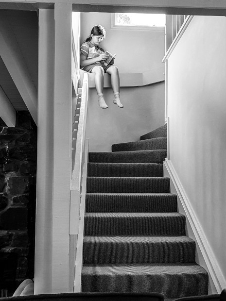 A young girl sits in an alcove in a stairwell reading with sunlight coming through the window above her