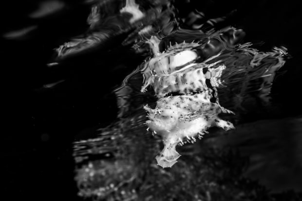 Drifting at the surface, a sargassum frogfish moves within its floating weed habitat, its algal camouflage reflected in the calm water above. Perfectly adapted to life among sargassum mats, it uses its arm-like fins to clamber through the weed, here briefly revealed in open water.