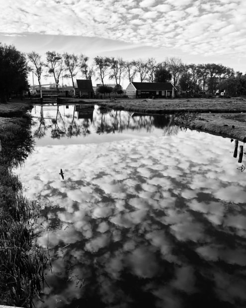 Countryside with reflection of bird in water