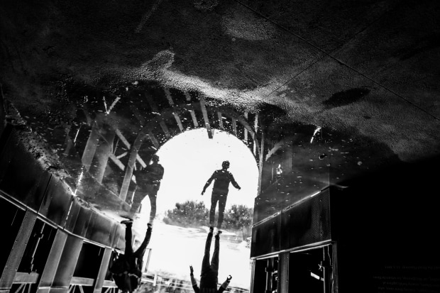 The silhouetted figures and the interplay of light and reflection evoke a sense of movement and mystery.