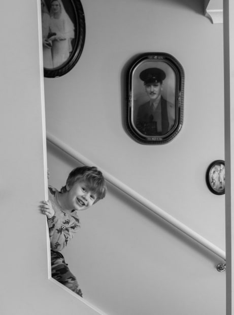Young grandson Riley grins at me through the opening to the staircase where portraits of past family members are displayed. He has no knowledge yet of his ancestors who, no doubt, would have loved his mischievous ways.